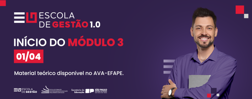 A Escola de Gestão 1.0 — 1ª Edição/2026 segue avançando em seu percurso formativo. A partir de 01 de abril de 2026, os cursistas já podem acessar o material teórico do Módulo 3 diretamente no AVA-EFAPE, dando continuidade às atividades previstas no curso.